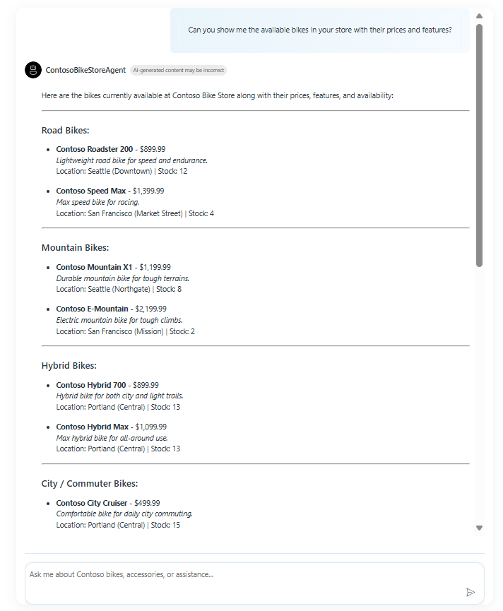 Now start chatting with the agent! You can ask the agent questions like: - What are the available bike models?